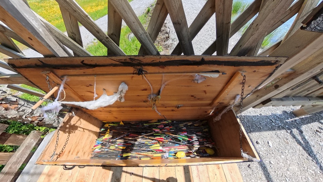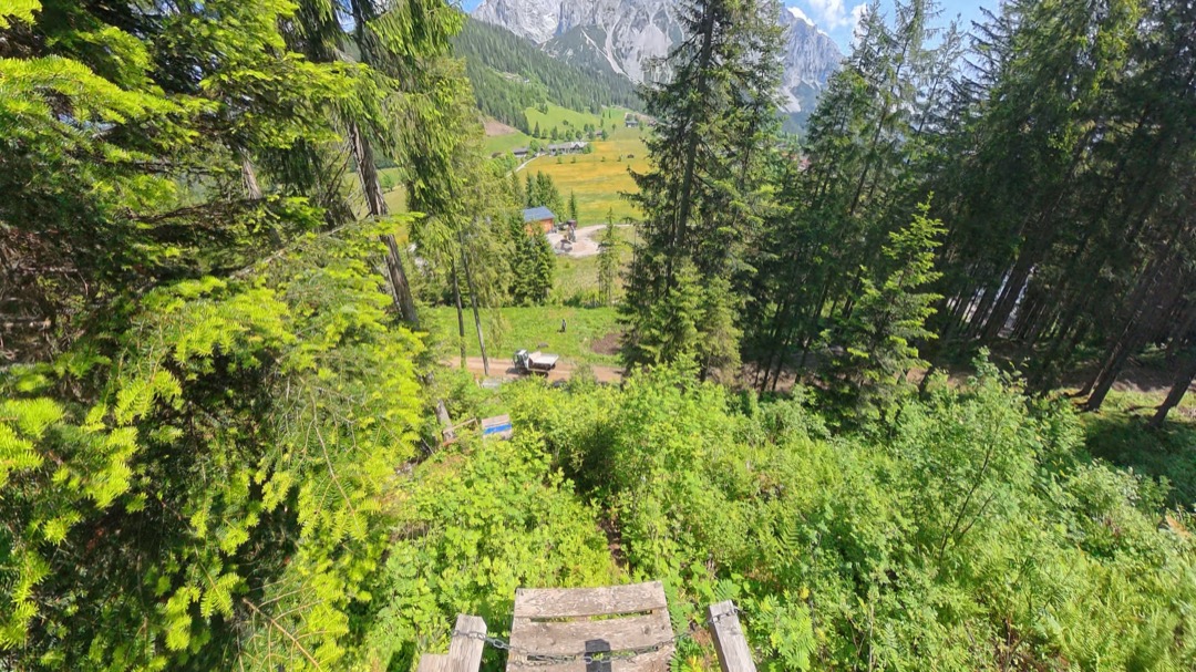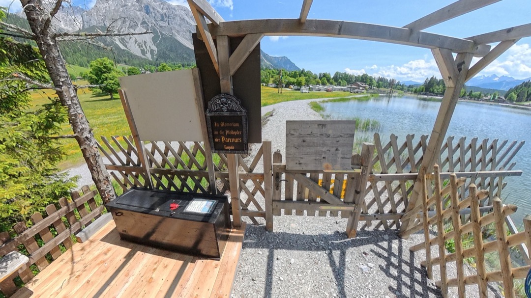 Wir haben auch nicht vergessen, dass ein anspruchsvoller Parcours die Kräfte raubt, deshalb gibt es in der Mitte des Weges die Schützentränke. Die perfekte Tankstelle gewissermaßen, um für die zweite Hälfte neue Kraft zu sammeln. Und all das bei einem der schönsten Ausblicke auf das imposante Dachsteinmassiv.